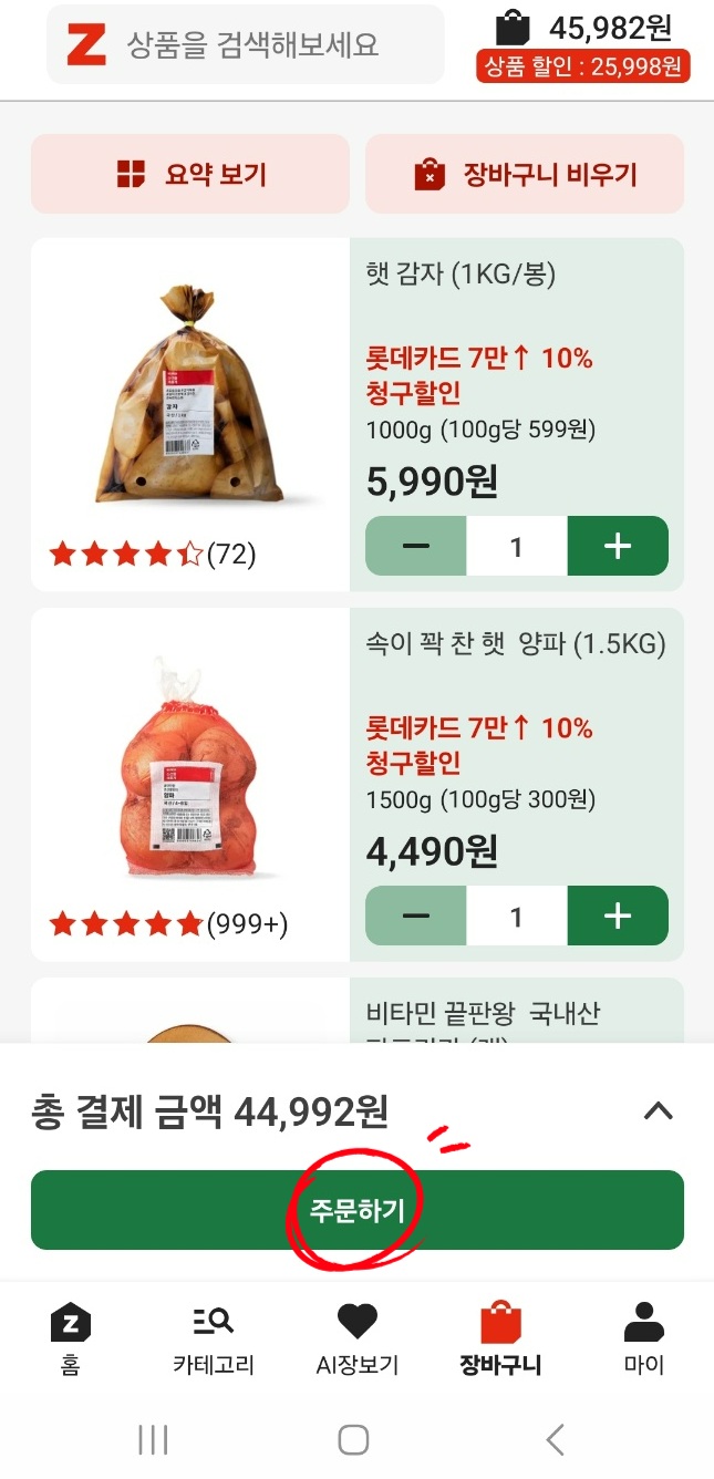 장본 상품을 장바구니에 담고, 주문하기를 터치하기.