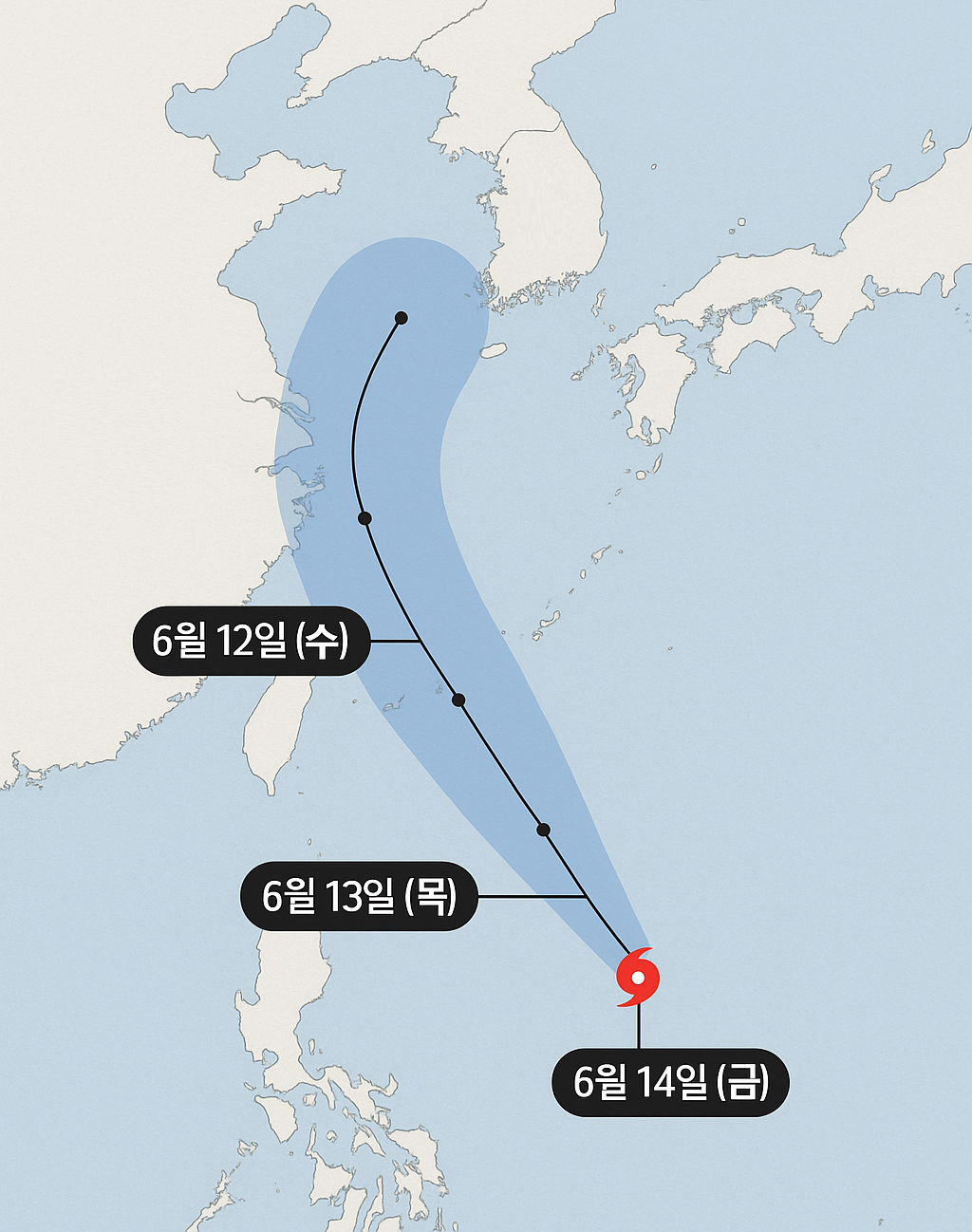 - 6월 14일(금): 제주도 남쪽 해상 접근, 남해안 일부 영향